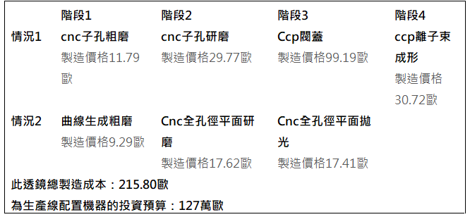 圖2. PanDao分析了平面-非球面BK7透鏡(圖1),每個透鏡的製造成本為185歐元,不包括8.7歐元的中心研磨成本,18.5歐元的鍍膜成本和18.2歐元的測試成本。.