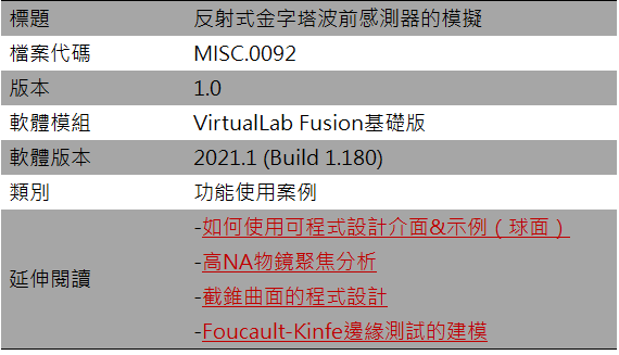 與傳統的夏克-哈特曼感測器相比,使用金字塔形棱鏡或反射器的波前感測器(PyWFS,用於金字塔波前感測器)具有高對比和更好的波前靈敏度,例如用於天文學中太陽系外行星的搜索。因此,這種類型的波前感測器用於特殊的望遠鏡(例如凱克天文臺),通常在紅外(IR)光譜範圍內。PyWFS通常由四邊棱鏡、重成像光學元件和適當的探測器組成。在這個例子中,我們展示了通過應用VirtualLab Fusion的快速物理光學場跟蹤技術,針對不同類型的像差,對這種金字塔形棱鏡的特徵光模式進行建模。