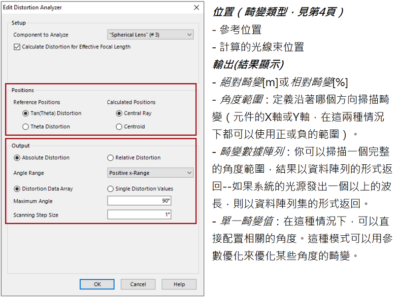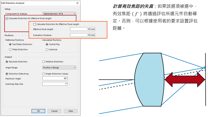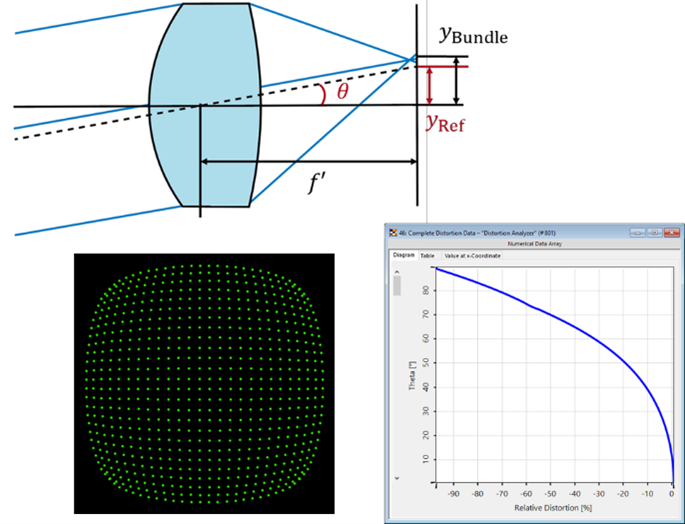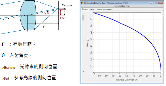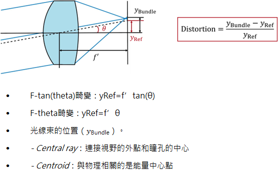 畸變與主光線的球面像差相對應。它被定義為光線束的橫向位置相對于焦平面的參考位置的偏差。使用掃描鏡頭的有效焦距(