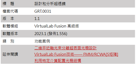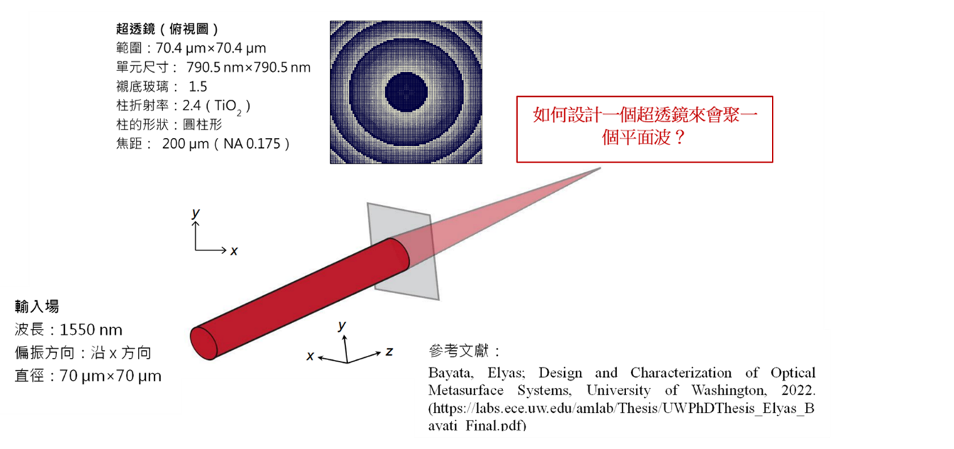 透鏡是一種透射光學裝置,通過改變相位來聚焦或發散光。與傳統透鏡不同,超透鏡的優點是能夠在非常薄的膜層中使用波長或更小尺寸的結構來實現所需的相位變化,而不需要複雜和大量的透鏡組。在這個例子中,我們展示了使用圓柱形介電奈米柱的超透鏡的設計過程。由於其奈米級結構和高折射率對比度,電磁場的全向量建模是必不可少的。對於初始設置,使用了E.Bayata的工作中的參數。