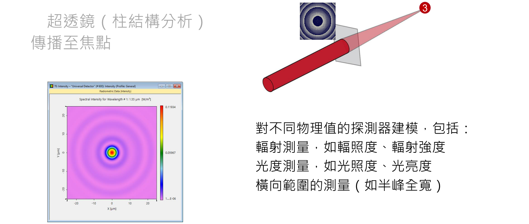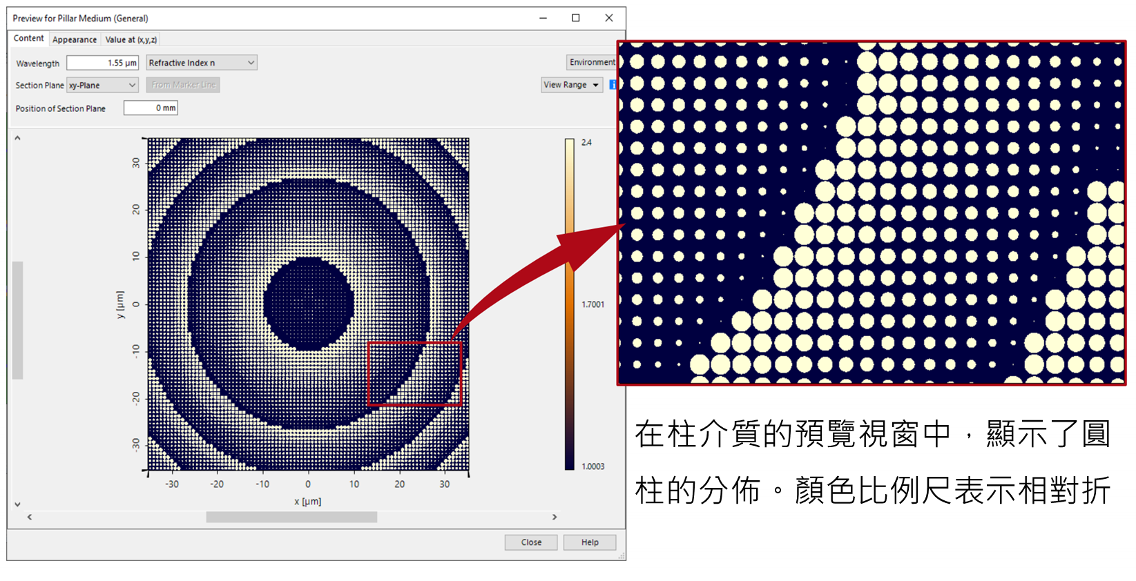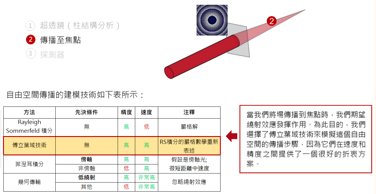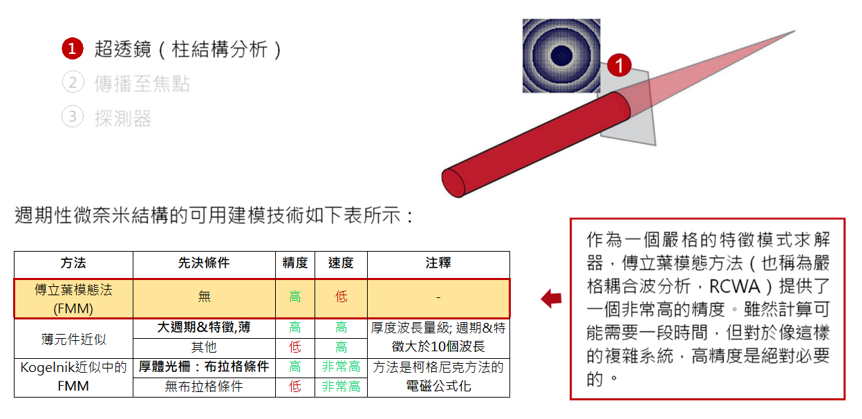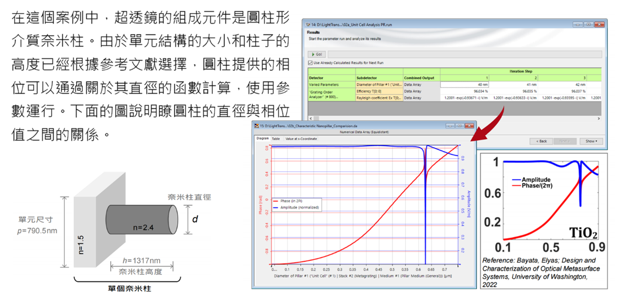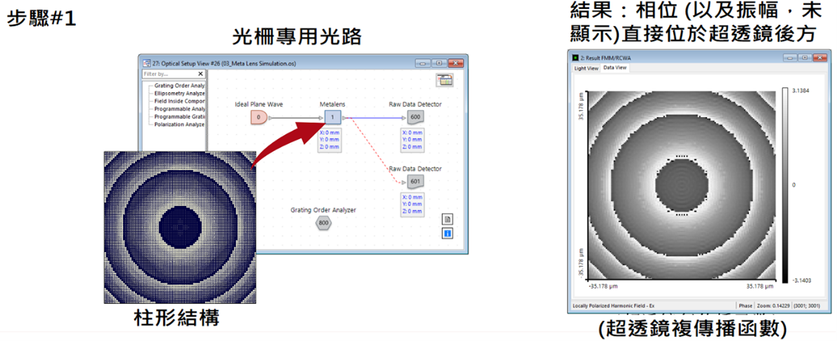 為了模擬柱形結構的函數,採用了傅立葉模態法(FMM,也稱為RCWA)。因此使用了帶有通用光柵元件的光柵專用光路。與在設計階段使用的方法相比,結果相位現在包括了附近不同奈米柱之間的相互作用。
