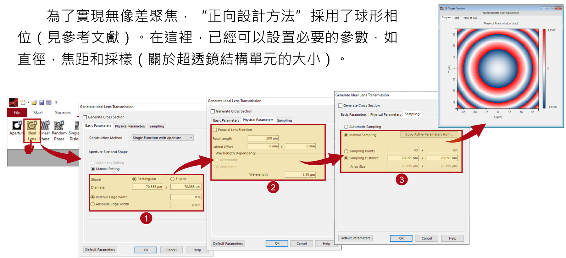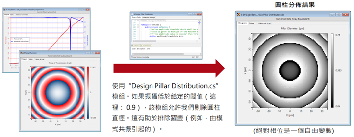 利用所需的光學函數和所選類型的超透鏡單元所提供的相位值,可以設計出橫向分佈。對於這一步,使用一個模組,它選擇適當的圓柱直徑來產生所需相位的橫向分佈。