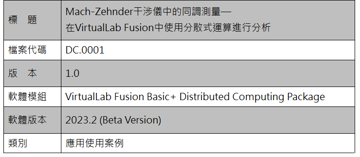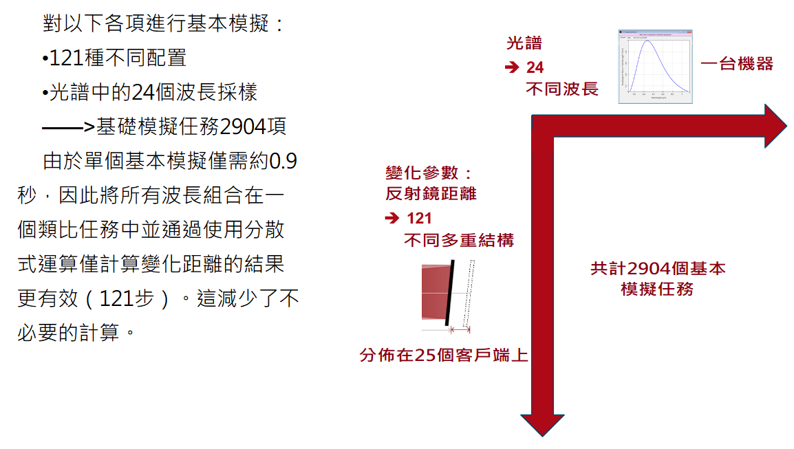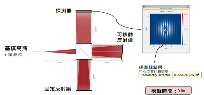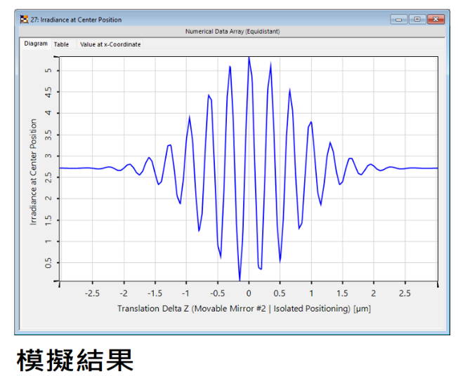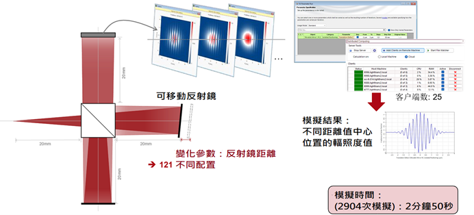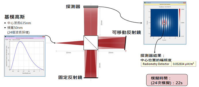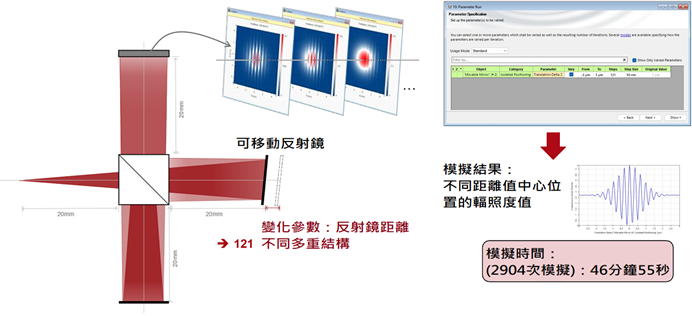 該案例將多色光源(24個波長)與邁克爾遜干涉儀設置中的反射鏡位置(121個位置)的參數掃描相結合。由此產生2904個基本模擬,其中每個類比在標準電腦上只需不到一秒鐘的時間。