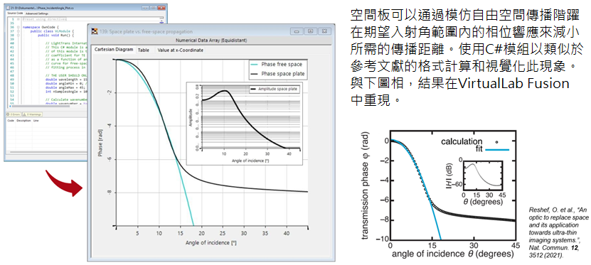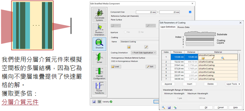 在許多現代光學應用中,實現最大可能的緊湊性是最受追捧的優化目標之一。造成這種情況的原因有很多:可擕式設備的光學元件安裝空間較小,而較小的系統往往具有較低的重量和材料成本。最近在這一領域提出的一種巧妙的策略是“空間板”:超表面允許在自由空間中模擬比空間板的實際厚度長得多的傳播。例如,這樣的元件可以縮短聚焦透鏡後的距離同時實現聚焦(不改變NA)。在這個例子中,我們展示了由Orad Reshef等人提出的多層超材料的空間板的特性,並研究了其在光學建模和設計軟體VirtualLab Fusion中的行為。